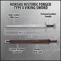 Included with the sword is a full leather-wrapped scabbard complete with a wooden belt loop, allowing you to carry your sword in true Viking fashion. Whether you are a historical sword enthusiast, a collector of fine blades, or a practitioner of historical European martial arts (HEMA), the Honshu Historic Forge Type X Viking Sword is an outstanding addition to any collection. The Honshu brand is synonymous with quality and performance, and this piece is a testament to the enduring legacy of the Viking sword tradition.