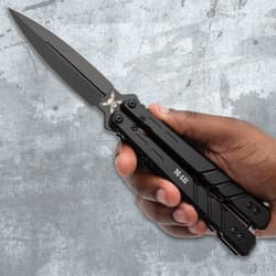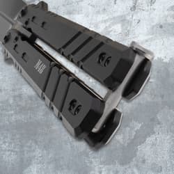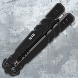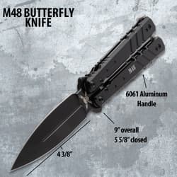The M48 Butterfly Knife is more than just a flipping knife for showing-off to your friends. It's built battle-ready with a razor-sharp blade that will make quick work of cutting and slicing tasks out in the field. The deeply ridged handles are incredibly tough and grippy and the handle latch is bead-blasted stainless steel. The blade fits securely between the handles to give the tactical butterfly knife a closed length that fits easily in your pocket or your gear.